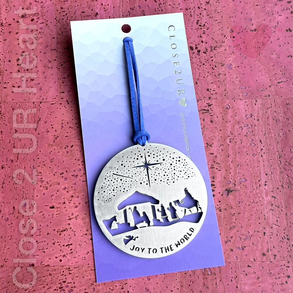 Original art ornament is made of 2mm stainless steel, is 2.5-inches wide and strung with a faux suede cord.