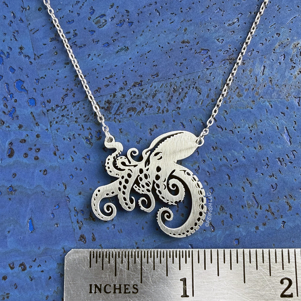 Original matte-finished stainless steel Octopus pendant is 1.375-inches wide, with a 16+2-inch stainless steel necklace and clasp.